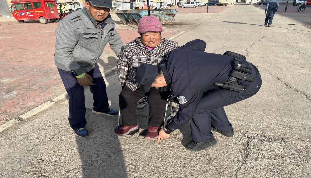 民警刘天礼、赵航将巡逻车辆停靠在路边,下车询问老人是否需要帮助。经询问得知,老人的老伴患有基础病脑梗,天气好的时候老人平时都会用轮椅推着老伴出来透透气,由于老人年岁已高,平时能推上去的一小截台阶今天却怎么也推不上去,刚好看见巡逻车组在附近,于是想寻求巡逻民警的帮助,民警听后立马将老人的老伴在轮椅上扶稳坐好,然后将两位老人一路送回到家中。