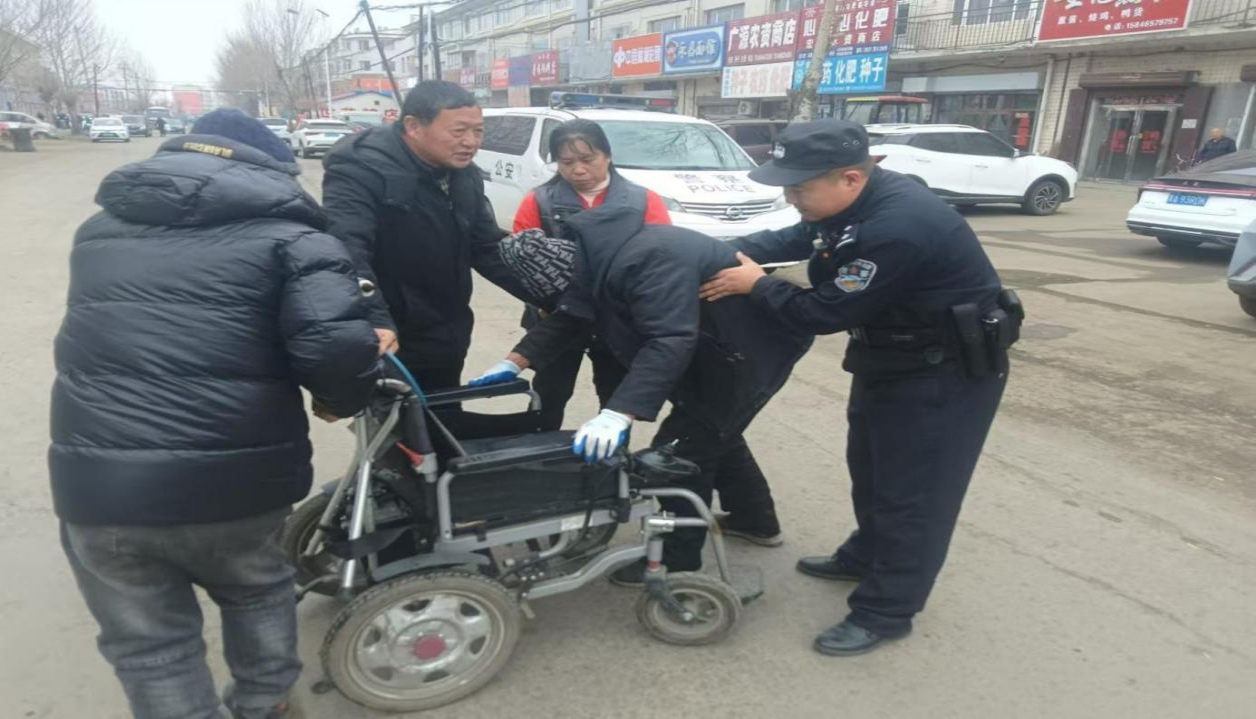 当日下午,巡逻民警齐梓航、王成龙在辖区内开展巡逻防控工作时,发现前方路边有一名老人坐着轮椅不慎摔倒在地,无法自行起身。情况紧急,见此情形,民警迅速下车,跑到老人身边查看情况。只见老人面色痛苦,双手紧紧抓着轮椅,试图挣扎起身却无果。