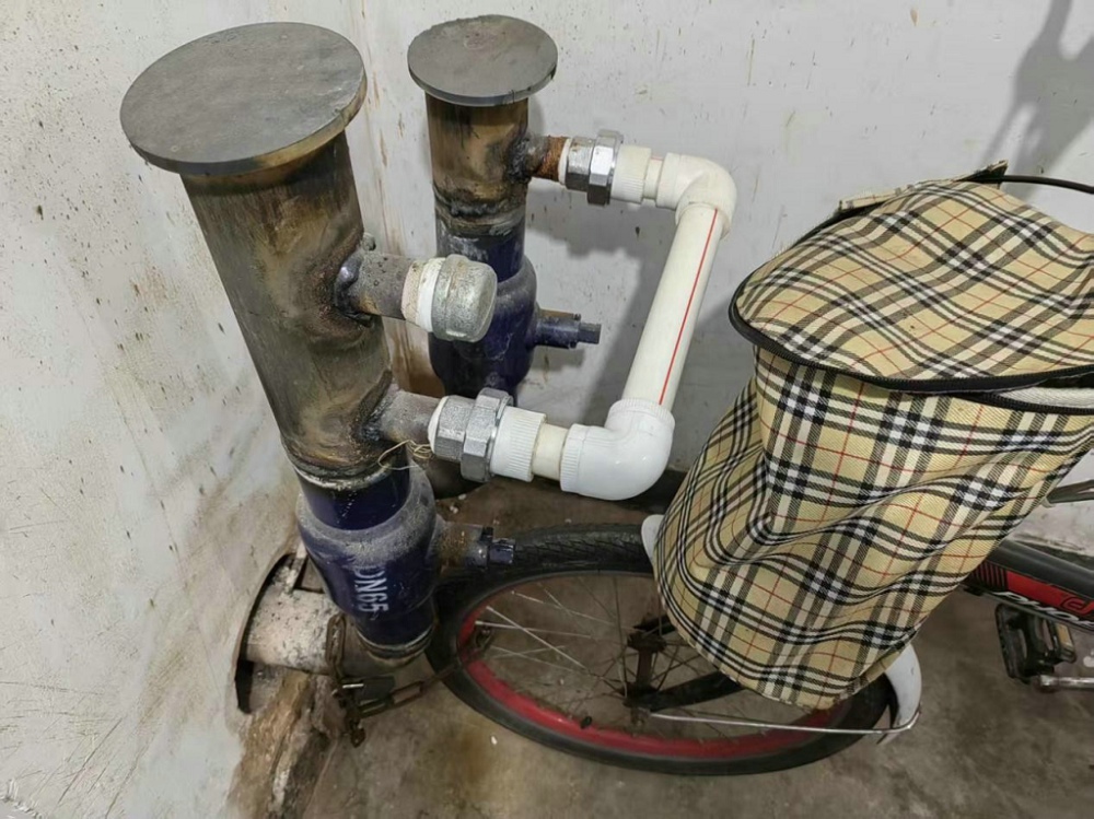 图为哈尔滨市道里区河柏小区112栋7单元现场:因该楼供热主管线存在严重安全隐患,少数用户拒绝配合分户改造,哈尔滨市华能公司第十五运营部被迫截断一至七楼的分户供热管线,改造工作暂停。