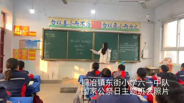 中国数字电视《社会与法》栏目河南安阳讯:为铭记历史、缅怀先烈,传承红色基因,引导学生树立爱国情怀与责任担当铜冶镇东街小学在国家公祭日前精心组织开展了主题班会、国旗下讲话、主题征文等系列教育活动,让全体师生在庄重的氛围中接受了一次深刻的爱国主义教育。